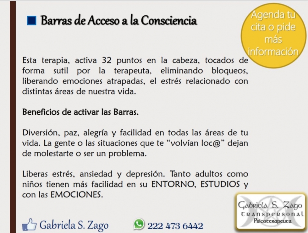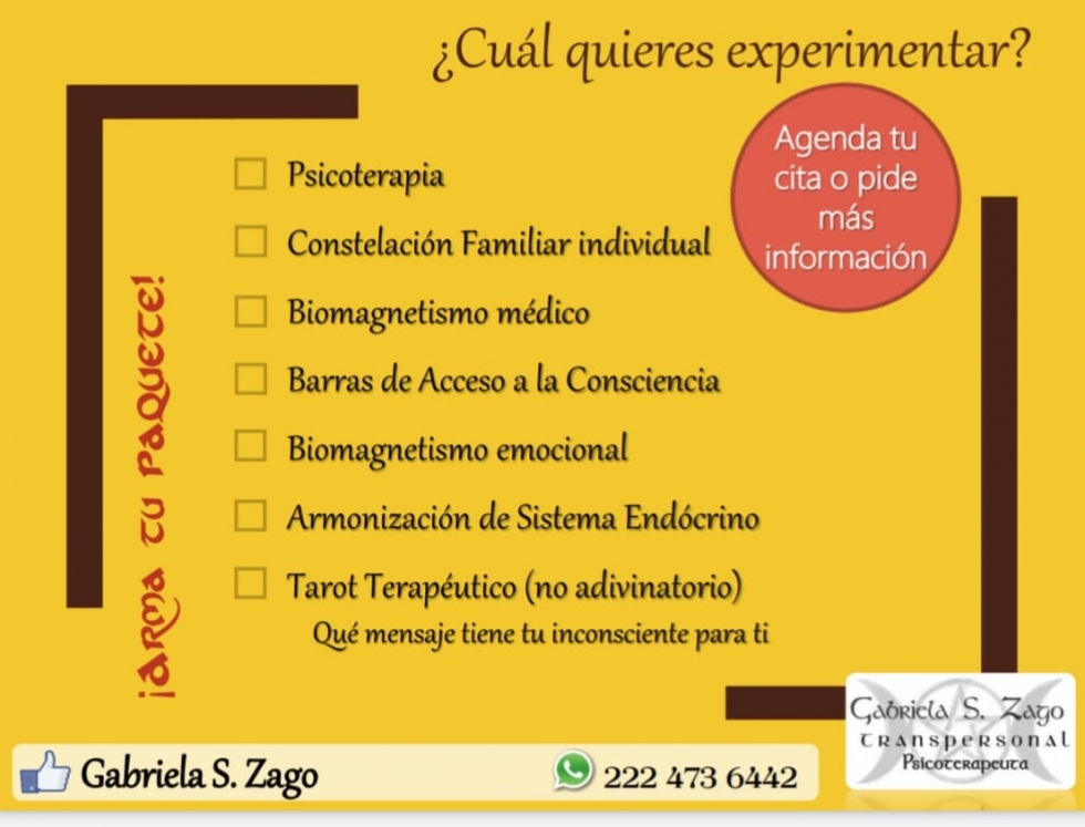 Psicoterapia Transpersonal, Terapia de Barras de Access Consciousness, Terapia de Biomagnetismo médico, Constelación familiar individual, Armonización de Chakras, Lectura de Tarot Terapéutico, Terapia con GeometrÃa Sagrada